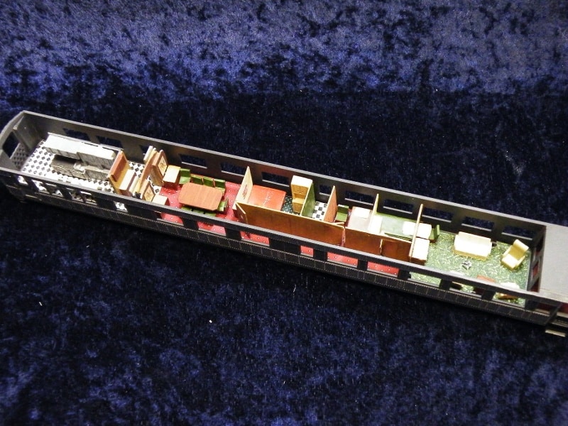 Contains Dining chairs, lounge chairs,sleeping berths, a metal floor/weight, and styrene to make interior walls. (Car shown is not included in interior kit.)